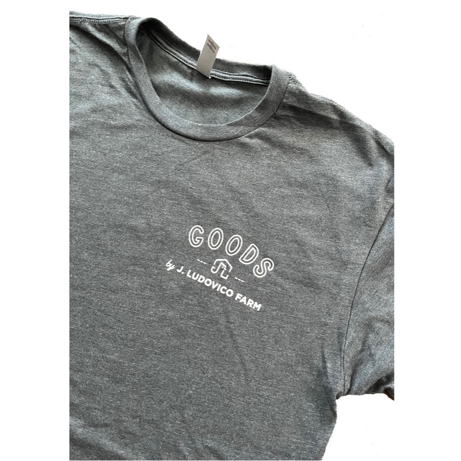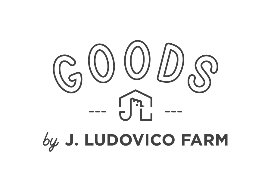 GOODS by J. Ludovico Farm logo is for spin-off product by J. Ludovico Farm. The farm is famous for their pasture-raised chickens. The logo is used for their by-products such as dog foods, original flavored salt and vegetables from their farm.